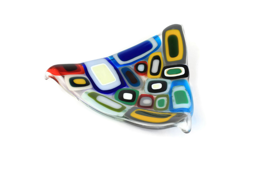 An eye popping little piece of glass, this vibrant colourful and carefully crafted little triangular dish is perfect for giving a room the wow factor. If you want your eyes to drink in colour, this is the piece for you. A spectacular little colourful piece packed with different coloured glass, four layers of glass melt together to produce a piece of glass that is pleasing to the eye and to the touch, if you run your fingers across the glass you can feel the crests of glass, making it an unusually tactile piece of art, even the edges have shape and texture making it a very special little piece of glass.