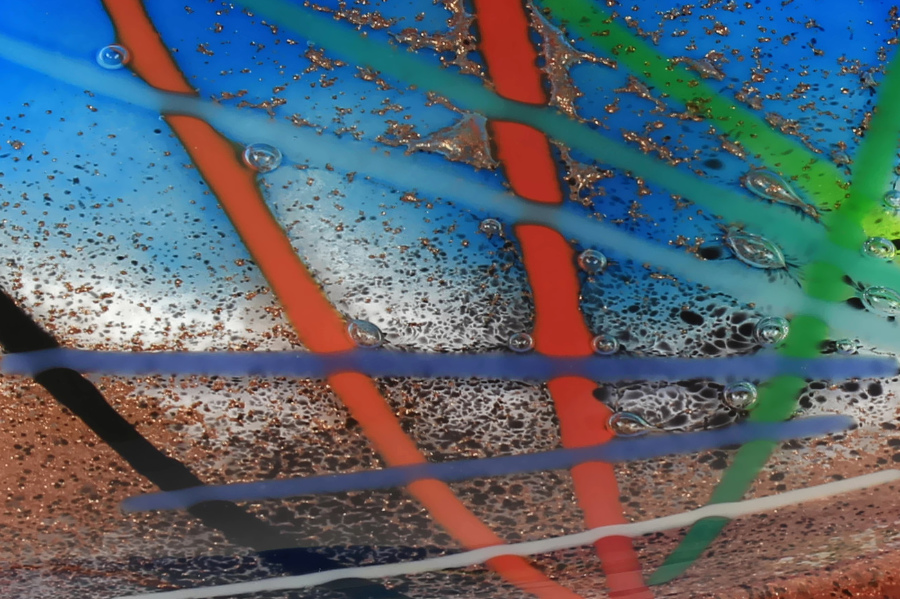 A very interesting little piece of glass art, combinations of colours and techniques united together to create something that will make you want to pick it up and look at the way the different elements have come together to create the final overall look. The contrasts between the shimmering gold, bubbles and streaks of colour that highlight the individual beauty of the glass. The slight curve on two of the edges gives the piece a feeling of movement and depth.