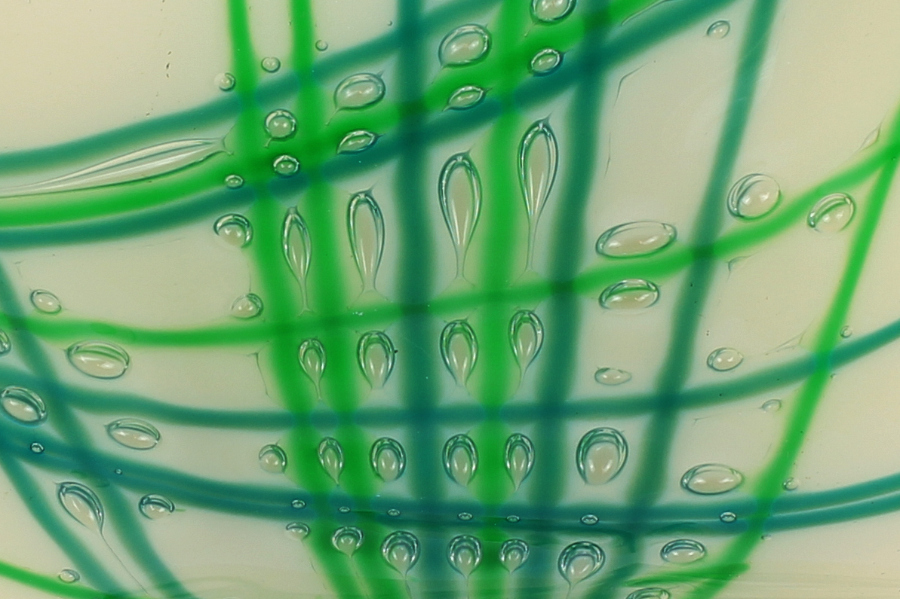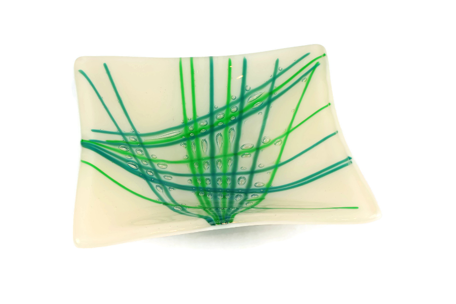 A simply stunning little dish, inspired by images of pond weed, moving in the water, releasing little bubbles of air that had been trapped. The green lines within the piece appear to have trapped the bubbles inside them, creating individual cells where the bubbles are trapped for eternity. Though a square piece its edges have a soft curve that is reflected in the gentle fall of the sides to a slightly rounded base. All in all a very special little piece of functional decorative glass.