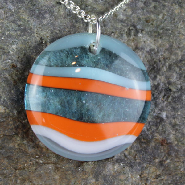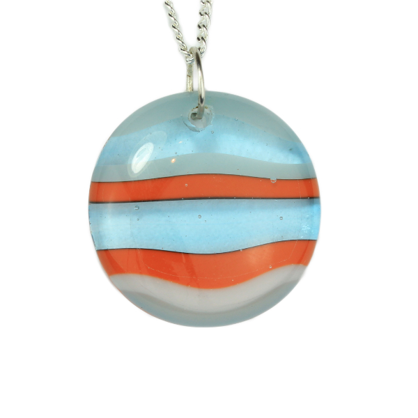 A circular pendant with stripes of bright orange and muted white running horizontally across it, simple and elegant, perfect gift for someone special or yourself.