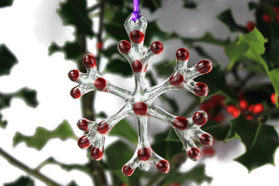 A crystal-clear snowflake, dotted with a splash of colour perfect to hang from a tree, or to enhance other decorations, beautiful in a window.