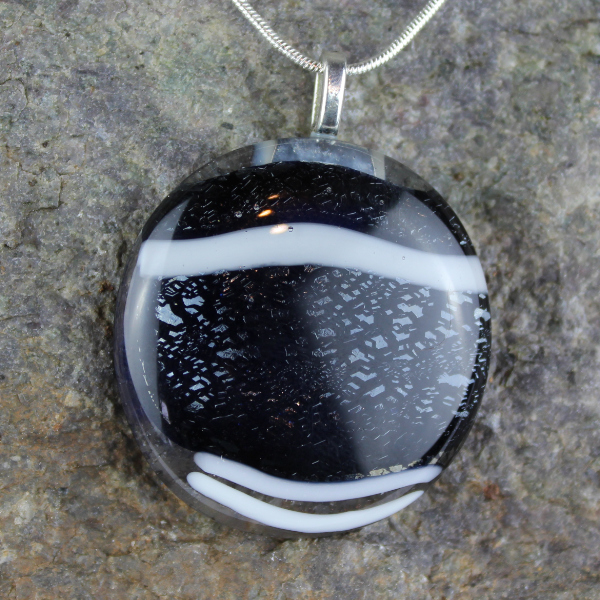 A circular pendant a sparking deep blue (almost black) with three bands of white crossing the face, a wonderful contrast. The spackle in the glass catches the light, perfect for that special evening out.
